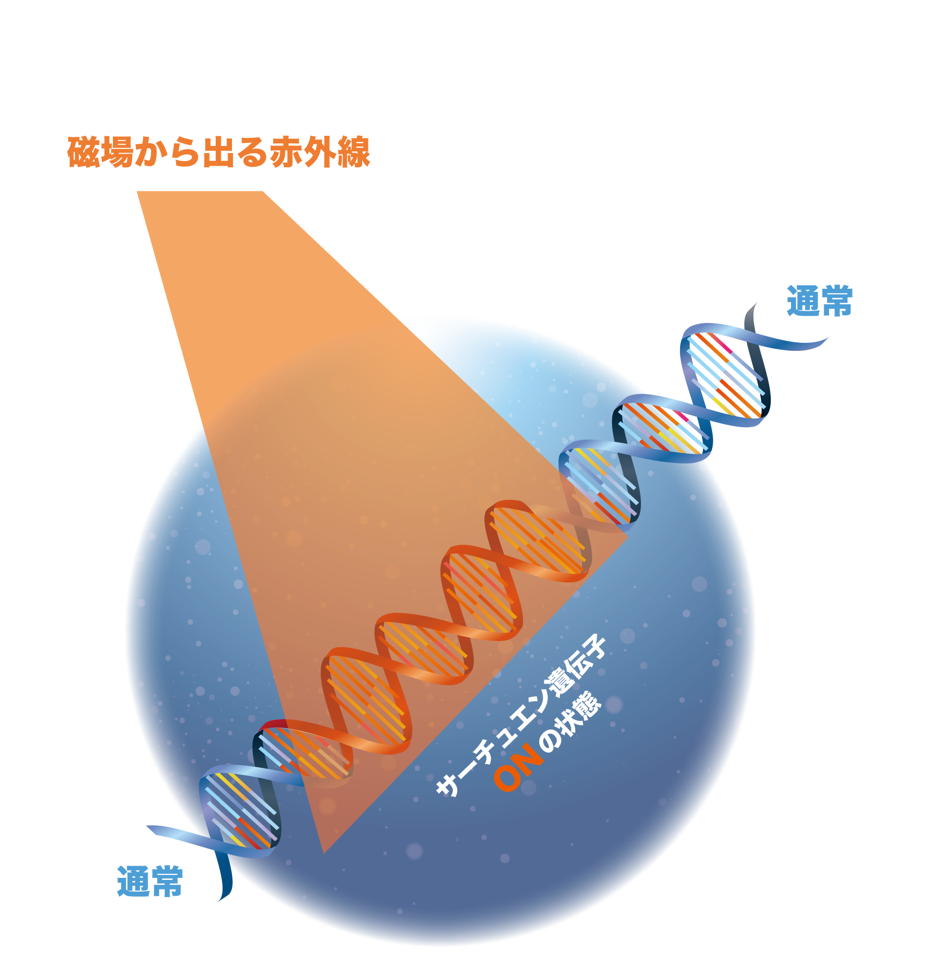 サーチュイン遺伝子は飢餓状態の時に働く遺伝子で、現代のような 飽食時代には眠っています。この遺伝子は細胞内で指揮者のような 働きをし、およそ 100 にも及ぶ老化要因を抑える効果があると考え られています。 MAT ネックレス・ MAT アンクレット・ MAT ブレスレットを 5 本 装着することにより血流が上昇して筋肉においてミトコンドリアの 量が増えることが明らかになりました。 人の体に備わりながら普段は OFF になっている「長寿遺伝子」 「若返り遺伝子」に直接働きかけ、細胞の寿命を延ばし、 人間の寿命そのものも伸ばしてくれる可能性にも繋がると考えられてます。