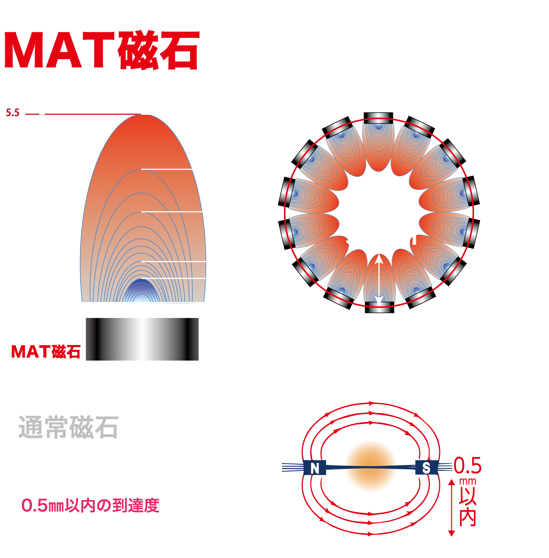 MATマグネットは広域磁場を形成するため、N極からでもS極からでも皮膚の表面から直角に約5.5mmの到達度があります。